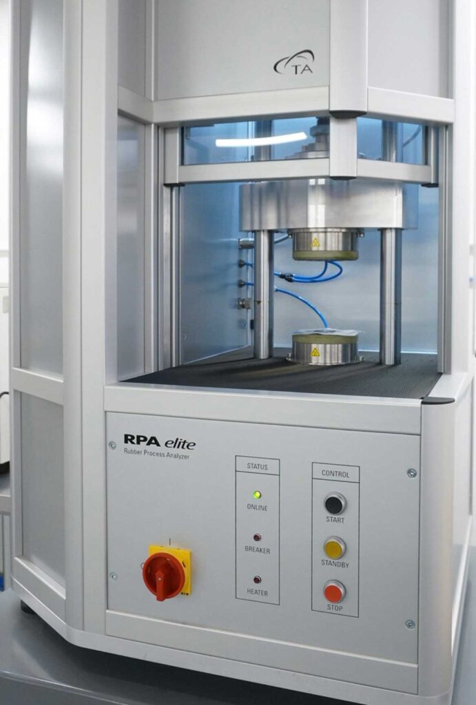 Rubber Lab: DMA, Mooney viscosity, RPA, tensile test frame, FTIR Spectroscopy, intermeshing rubber kneader/mixer, two roll mill, curing press, curing oven, compression set
